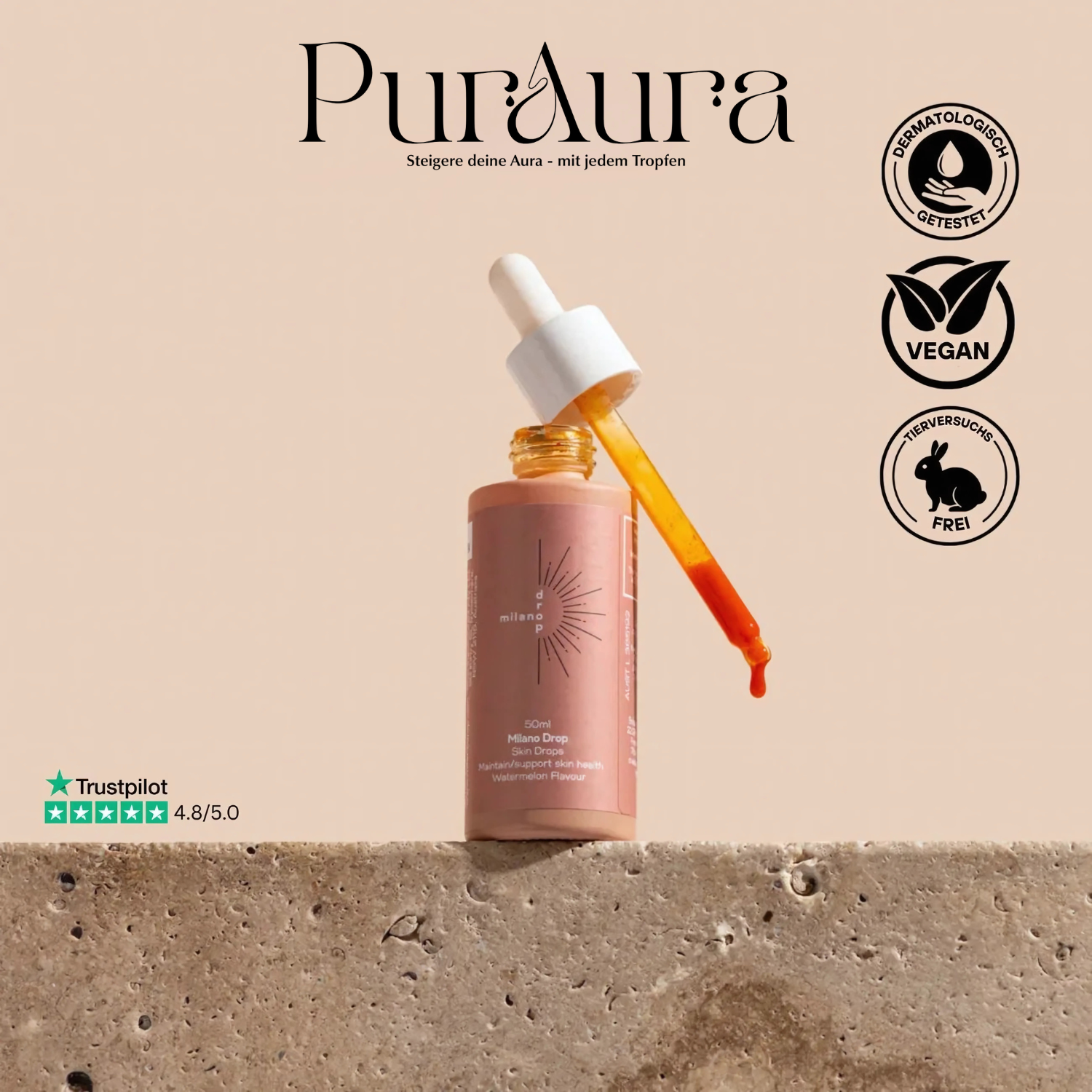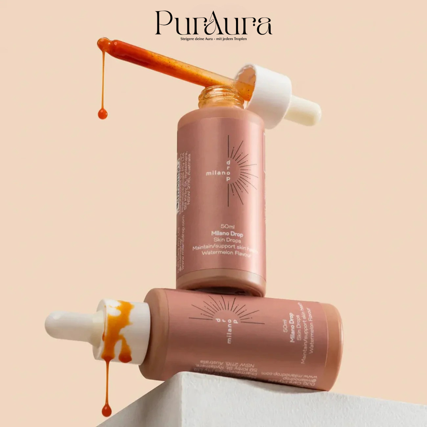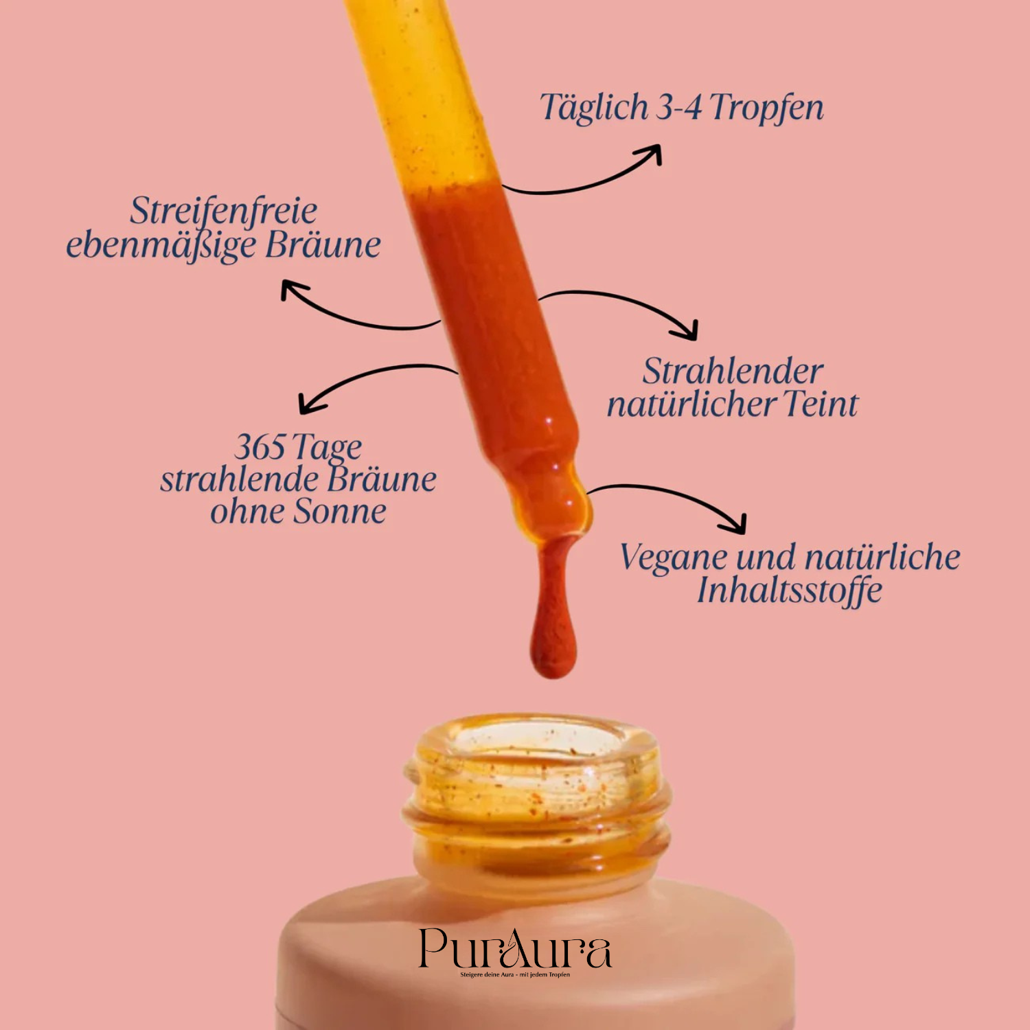 Nur wenige Tropfen von PurAura genügen um deine Haut von innen heraus zu bräunen– gleichmäßig, strahlend & sonnengeküsst.Ohne UV, ohne Streifen, ohne Aufwand. Die vegane Formel schmeckt angenehm frisch, pflegt deine Haut von innen und wird ganz selbstverständlich Teil deiner Beautyroutine. Für einen Glow, der bleibt– und sich genauso gut anfühlt, wie er aussieht.