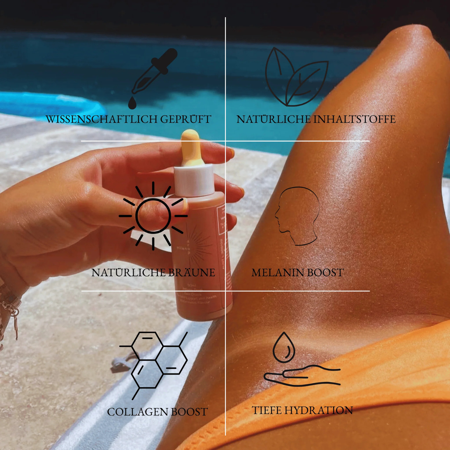 Unsere natürlichen Bräunungs-Drops setzen genau dort an: Sie unterstützen deinen Körper dabei, auf sanfte Weise mehr Melanin zu bilden – ganz ohne UV-Licht und ohne künstliche Zusätze. Mit Inhaltsstoffen wie L-Tyrosin, Kupfer und Beta-Carotin wird deine Bräune von innen aufgebaut – gleichmäßig, gepflegt und natürlich. Einfach täglich ein paar Tropfen in dein Lieblingsgetränk geben – und dein Teint entwickelt Schritt für Schritt einen gesunden, goldbraunen Glow. Sanft, einfach und wirkungsvoll.